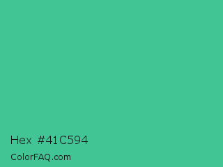 Hex #41c594 Color is a normal green color and the nearest color is Ocean Green #48bf91. Hex code #41c594 and RGB value is rgb(65,197,148). In RGB color space, this color is composed of 25% red, 77% green, 58% blue, In CMYK color space, this color is composed of 67% cyan, 0% magenta, 25% yellow , 23% black , In HSL color space, this color has a hue angle of 158° , 53% saturation and 51% lightness.