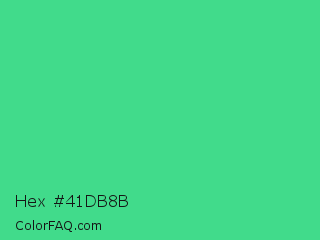 Hex #41db8b Color is a normal green color and the nearest color is Shamrock #33cc99. Hex code #41db8b and RGB value is rgb(65,219,139). In RGB color space, this color is composed of 25% red, 86% green, 55% blue, In CMYK color space, this color is composed of 70% cyan, 0% magenta, 37% yellow , 14% black , In HSL color space, this color has a hue angle of 149° , 68% saturation and 56% lightness.