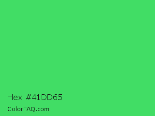 Hex #41dd65 Color is a normal green color and the nearest color is UFO Green #3cd070. Hex code #41dd65 and RGB value is rgb(65,221,101). In RGB color space, this color is composed of 25% red, 87% green, 40% blue, In CMYK color space, this color is composed of 71% cyan, 0% magenta, 54% yellow , 13% black , In HSL color space, this color has a hue angle of 134° , 70% saturation and 56% lightness.