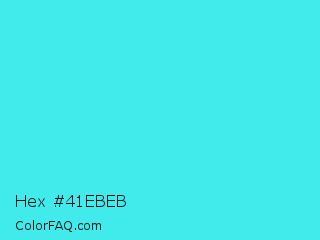 Hex #41ebeb Color is a normal cyan color and the nearest color is Turquoise #40e0d0. Hex code #41ebeb and RGB value is rgb(65,235,235). In RGB color space, this color is composed of 25% red, 92% green, 92% blue, In CMYK color space, this color is composed of 72% cyan, 0% magenta, 0% yellow , 8% black , In HSL color space, this color has a hue angle of 180° , 81% saturation and 59% lightness.