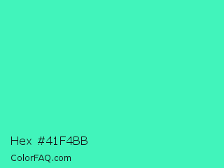 Hex #41f4bb Color is a light green color and the nearest color is Turquoise #40e0d0. Hex code #41f4bb and RGB value is rgb(65,244,187). In RGB color space, this color is composed of 25% red, 96% green, 73% blue, In CMYK color space, this color is composed of 73% cyan, 0% magenta, 23% yellow , 4% black , In HSL color space, this color has a hue angle of 161° , 89% saturation and 61% lightness.