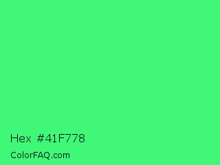 Hex #41f778 Color is a light green color and the nearest color is UFO Green #3cd070. Hex code #41f778 and RGB value is rgb(65,247,120). In RGB color space, this color is composed of 25% red, 97% green, 47% blue, In CMYK color space, this color is composed of 74% cyan, 0% magenta, 51% yellow , 3% black , In HSL color space, this color has a hue angle of 138° , 92% saturation and 61% lightness.