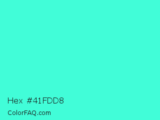 Hex #41fdd8 Color is a light cyan color and the nearest color is Turquoise #40e0d0. Hex code #41fdd8 and RGB value is rgb(65,253,216). In RGB color space, this color is composed of 25% red, 99% green, 85% blue, In CMYK color space, this color is composed of 74% cyan, 0% magenta, 15% yellow , 1% black , In HSL color space, this color has a hue angle of 168° , 98% saturation and 62% lightness.