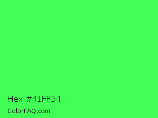 Hex #41ff54 Color is a light green color and the nearest color is Screamin Green #66ff66. Hex code #41ff54 and RGB value is rgb(65,255,84). In RGB color space, this color is composed of 25% red, 100% green, 33% blue, In CMYK color space, this color is composed of 75% cyan, 0% magenta, 67% yellow , 0% black , In HSL color space, this color has a hue angle of 126° , 100% saturation and 63% lightness.