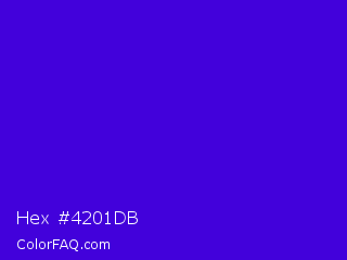 Hex #4201db Color is a normal indigo color and the nearest color is Interdimensional Blue #360ccc. Hex code #4201db and RGB value is rgb(66,1,219). In RGB color space, this color is composed of 26% red, 0% green, 86% blue, In CMYK color space, this color is composed of 70% cyan, 100% magenta, 0% yellow , 14% black , In HSL color space, this color has a hue angle of 258° , 99% saturation and 43% lightness.