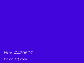 Hex #4206dc Color is a normal indigo color and the nearest color is Interdimensional Blue #360ccc. Hex code #4206dc and RGB value is rgb(66,6,220). In RGB color space, this color is composed of 26% red, 2% green, 86% blue, In CMYK color space, this color is composed of 70% cyan, 97% magenta, 0% yellow , 14% black , In HSL color space, this color has a hue angle of 257° , 95% saturation and 44% lightness.