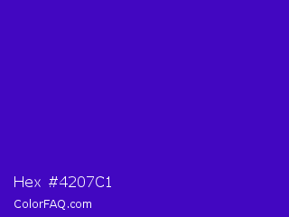 Hex #4207c1 Color is a normal indigo color and the nearest color is Interdimensional Blue #360ccc. Hex code #4207c1 and RGB value is rgb(66,7,193). In RGB color space, this color is composed of 26% red, 3% green, 76% blue, In CMYK color space, this color is composed of 66% cyan, 96% magenta, 0% yellow , 24% black , In HSL color space, this color has a hue angle of 259° , 93% saturation and 39% lightness.