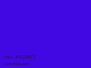 Hex #4208e3 Color is a normal indigo color and the nearest color is Interdimensional Blue #360ccc. Hex code #4208e3 and RGB value is rgb(66,8,227). In RGB color space, this color is composed of 26% red, 3% green, 89% blue, In CMYK color space, this color is composed of 71% cyan, 96% magenta, 0% yellow , 11% black , In HSL color space, this color has a hue angle of 256° , 93% saturation and 46% lightness.