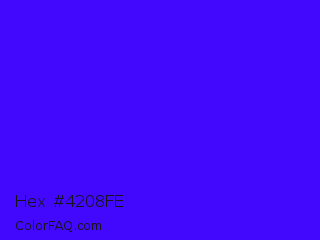 Hex #4208fe Color is a normal indigo color and the nearest color is Electric Ultramarine #3f00ff. Hex code #4208fe and RGB value is rgb(66,8,254). In RGB color space, this color is composed of 26% red, 3% green, 100% blue, In CMYK color space, this color is composed of 74% cyan, 97% magenta, 0% yellow , 0% black , In HSL color space, this color has a hue angle of 254° , 99% saturation and 51% lightness.