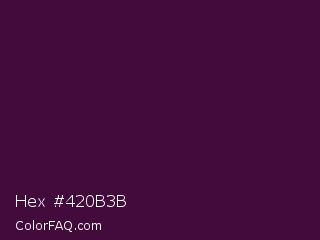 Hex #420b3b Color is a very dark magenta color and the nearest color is Loulou #460b41. Hex code #420b3b and RGB value is rgb(66,11,59). In RGB color space, this color is composed of 26% red, 4% green, 23% blue, In CMYK color space, this color is composed of 0% cyan, 83% magenta, 11% yellow , 74% black , In HSL color space, this color has a hue angle of 308° , 71% saturation and 15% lightness.