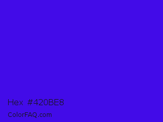 Hex #420be8 Color is a normal indigo color and the nearest color is Electric Ultramarine #3f00ff. Hex code #420be8 and RGB value is rgb(66,11,232). In RGB color space, this color is composed of 26% red, 4% green, 91% blue, In CMYK color space, this color is composed of 72% cyan, 95% magenta, 0% yellow , 9% black , In HSL color space, this color has a hue angle of 255° , 91% saturation and 48% lightness.