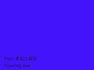 Hex #4214fb Color is a normal indigo color and the nearest color is Han Purple #5218fa. Hex code #4214fb and RGB value is rgb(66,20,251). In RGB color space, this color is composed of 26% red, 8% green, 98% blue, In CMYK color space, this color is composed of 74% cyan, 92% magenta, 0% yellow , 2% black , In HSL color space, this color has a hue angle of 252° , 97% saturation and 53% lightness.
