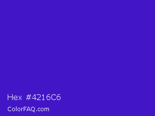 Hex #4216c6 Color is a normal indigo color and the nearest color is Interdimensional Blue #360ccc. Hex code #4216c6 and RGB value is rgb(66,22,198). In RGB color space, this color is composed of 26% red, 9% green, 78% blue, In CMYK color space, this color is composed of 67% cyan, 89% magenta, 0% yellow , 22% black , In HSL color space, this color has a hue angle of 255° , 80% saturation and 43% lightness.