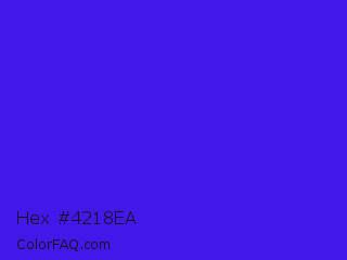 Hex #4218ea Color is a normal indigo color and the nearest color is Han Purple #5218fa. Hex code #4218ea and RGB value is rgb(66,24,234). In RGB color space, this color is composed of 26% red, 9% green, 92% blue, In CMYK color space, this color is composed of 72% cyan, 90% magenta, 0% yellow , 8% black , In HSL color space, this color has a hue angle of 252° , 83% saturation and 51% lightness.