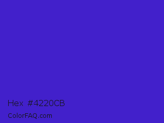 Hex #4220cb Color is a normal indigo color and the nearest color is Interdimensional Blue #360ccc. Hex code #4220cb and RGB value is rgb(66,32,203). In RGB color space, this color is composed of 26% red, 13% green, 80% blue, In CMYK color space, this color is composed of 67% cyan, 84% magenta, 0% yellow , 20% black , In HSL color space, this color has a hue angle of 252° , 73% saturation and 46% lightness.