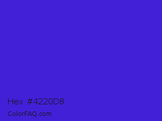 Hex #4220d8 Color is a normal indigo color and the nearest color is Interdimensional Blue #360ccc. Hex code #4220d8 and RGB value is rgb(66,32,216). In RGB color space, this color is composed of 26% red, 13% green, 85% blue, In CMYK color space, this color is composed of 69% cyan, 85% magenta, 0% yellow , 15% black , In HSL color space, this color has a hue angle of 251° , 74% saturation and 49% lightness.