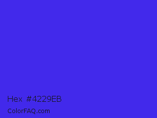 Hex #4229eb Color is a normal indigo color and the nearest color is Han Purple #5218fa. Hex code #4229eb and RGB value is rgb(66,41,235). In RGB color space, this color is composed of 26% red, 16% green, 92% blue, In CMYK color space, this color is composed of 72% cyan, 83% magenta, 0% yellow , 8% black , In HSL color space, this color has a hue angle of 248° , 83% saturation and 54% lightness.