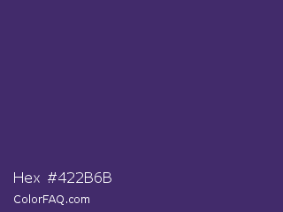 Hex #422b6b Color is a dark violet color and the nearest color is Jacarta #3a2a6a. Hex code #422b6b and RGB value is rgb(66,43,107). In RGB color space, this color is composed of 26% red, 17% green, 42% blue, In CMYK color space, this color is composed of 38% cyan, 60% magenta, 0% yellow , 58% black , In HSL color space, this color has a hue angle of 262° , 43% saturation and 29% lightness.