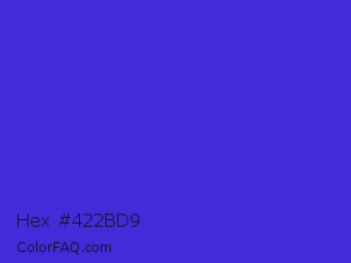 Hex #422bd9 Color is a normal indigo color and the nearest color is Palatinate Blue #273be2. Hex code #422bd9 and RGB value is rgb(66,43,217). In RGB color space, this color is composed of 26% red, 17% green, 85% blue, In CMYK color space, this color is composed of 70% cyan, 80% magenta, 0% yellow , 15% black , In HSL color space, this color has a hue angle of 248° , 70% saturation and 51% lightness.