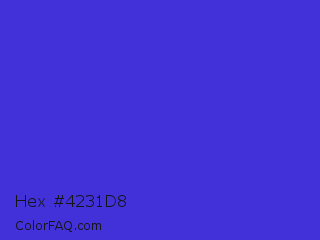 Hex #4231d8 Color is a normal indigo color and the nearest color is Palatinate Blue #273be2. Hex code #4231d8 and RGB value is rgb(66,49,216). In RGB color space, this color is composed of 26% red, 19% green, 85% blue, In CMYK color space, this color is composed of 69% cyan, 77% magenta, 0% yellow , 15% black , In HSL color space, this color has a hue angle of 246° , 68% saturation and 52% lightness.