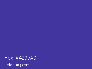 Hex #4235a0 Color is a normal indigo color and the nearest color is Blue Pigment #333399. Hex code #4235a0 and RGB value is rgb(66,53,160). In RGB color space, this color is composed of 26% red, 21% green, 63% blue, In CMYK color space, this color is composed of 59% cyan, 67% magenta, 0% yellow , 37% black , In HSL color space, this color has a hue angle of 247° , 50% saturation and 42% lightness.