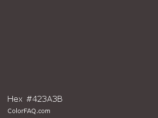 Hex #423a3b Color is a dark red color and the nearest color is Masala #403b38. Hex code #423a3b and RGB value is rgb(66,58,59). In RGB color space, this color is composed of 26% red, 23% green, 23% blue, In CMYK color space, this color is composed of 0% cyan, 12% magenta, 11% yellow , 74% black , In HSL color space, this color has a hue angle of 353° , 6% saturation and 24% lightness.