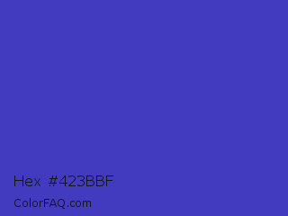 Hex #423bbf Color is a normal indigo color and the nearest color is Ocean Blue #4f42b5. Hex code #423bbf and RGB value is rgb(66,59,191). In RGB color space, this color is composed of 26% red, 23% green, 75% blue, In CMYK color space, this color is composed of 65% cyan, 69% magenta, 0% yellow , 25% black , In HSL color space, this color has a hue angle of 243° , 53% saturation and 49% lightness.