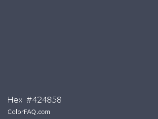 Hex #424858 Color is a dark blue color and the nearest color is River Bed #434c59. Hex code #424858 and RGB value is rgb(66,72,88). In RGB color space, this color is composed of 26% red, 28% green, 35% blue, In CMYK color space, this color is composed of 25% cyan, 18% magenta, 0% yellow , 65% black , In HSL color space, this color has a hue angle of 224° , 14% saturation and 30% lightness.