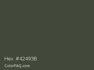 Hex #42493b Color is a dark green color and the nearest color is Cabbage Pont #3f4c3a. Hex code #42493b and RGB value is rgb(66,73,59). In RGB color space, this color is composed of 26% red, 29% green, 23% blue, In CMYK color space, this color is composed of 10% cyan, 0% magenta, 19% yellow , 71% black , In HSL color space, this color has a hue angle of 90° , 11% saturation and 26% lightness.