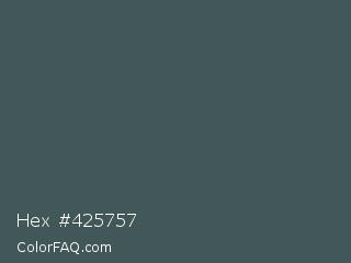 Hex #425757 Color is a dark cyan color and the nearest color is Mineral Green #3f5d53. Hex code #425757 and RGB value is rgb(66,87,87). In RGB color space, this color is composed of 26% red, 34% green, 34% blue, In CMYK color space, this color is composed of 24% cyan, 0% magenta, 0% yellow , 66% black , In HSL color space, this color has a hue angle of 180° , 14% saturation and 30% lightness.