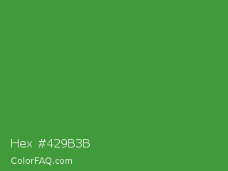 Hex #429b3b Color is a normal green color and the nearest color is May Green #4c9141. Hex code #429b3b and RGB value is rgb(66,155,59). In RGB color space, this color is composed of 26% red, 61% green, 23% blue, In CMYK color space, this color is composed of 57% cyan, 0% magenta, 62% yellow , 39% black , In HSL color space, this color has a hue angle of 116° , 45% saturation and 42% lightness.