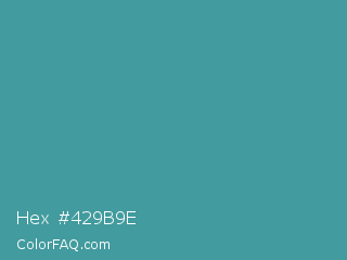 Hex #429b9e Color is a normal cyan color and the nearest color is Zomp #39a78e. Hex code #429b9e and RGB value is rgb(66,155,158). In RGB color space, this color is composed of 26% red, 61% green, 62% blue, In CMYK color space, this color is composed of 58% cyan, 2% magenta, 0% yellow , 38% black , In HSL color space, this color has a hue angle of 182° , 41% saturation and 44% lightness.
