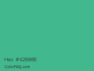 Hex #42b88e Color is a normal green color and the nearest color is Mint #3eb489. Hex code #42b88e and RGB value is rgb(66,184,142). In RGB color space, this color is composed of 26% red, 72% green, 56% blue, In CMYK color space, this color is composed of 64% cyan, 0% magenta, 23% yellow , 28% black , In HSL color space, this color has a hue angle of 159° , 47% saturation and 49% lightness.
