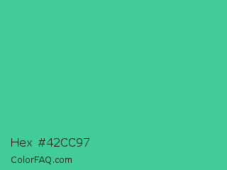 Hex #42cc97 Color is a normal green color and the nearest color is Shamrock #33cc99. Hex code #42cc97 and RGB value is rgb(66,204,151). In RGB color space, this color is composed of 26% red, 80% green, 59% blue, In CMYK color space, this color is composed of 68% cyan, 0% magenta, 26% yellow , 20% black , In HSL color space, this color has a hue angle of 157° , 58% saturation and 53% lightness.