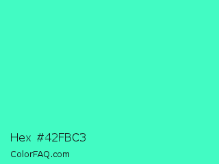 Hex #42fbc3 Color is a light green color and the nearest color is Turquoise #40e0d0. Hex code #42fbc3 and RGB value is rgb(66,251,195). In RGB color space, this color is composed of 26% red, 98% green, 76% blue, In CMYK color space, this color is composed of 74% cyan, 0% magenta, 22% yellow , 2% black , In HSL color space, this color has a hue angle of 162° , 96% saturation and 62% lightness.