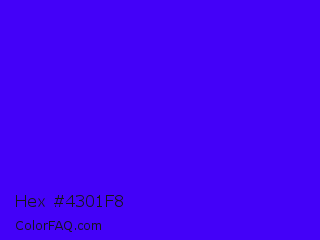 Hex #4301f8 Color is a normal indigo color and the nearest color is Electric Ultramarine #3f00ff. Hex code #4301f8 and RGB value is rgb(67,1,248). In RGB color space, this color is composed of 26% red, 0% green, 97% blue, In CMYK color space, this color is composed of 73% cyan, 100% magenta, 0% yellow , 3% black , In HSL color space, this color has a hue angle of 256° , 99% saturation and 49% lightness.