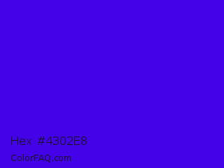 Hex #4302e8 Color is a normal indigo color and the nearest color is Electric Ultramarine #3f00ff. Hex code #4302e8 and RGB value is rgb(67,2,232). In RGB color space, this color is composed of 26% red, 1% green, 91% blue, In CMYK color space, this color is composed of 71% cyan, 99% magenta, 0% yellow , 9% black , In HSL color space, this color has a hue angle of 257° , 98% saturation and 46% lightness.