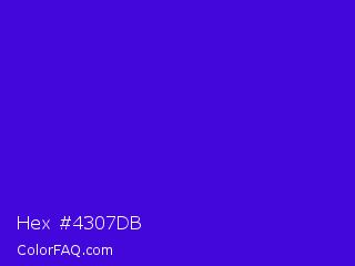 Hex #4307db Color is a normal indigo color and the nearest color is Interdimensional Blue #360ccc. Hex code #4307db and RGB value is rgb(67,7,219). In RGB color space, this color is composed of 26% red, 3% green, 86% blue, In CMYK color space, this color is composed of 69% cyan, 97% magenta, 0% yellow , 14% black , In HSL color space, this color has a hue angle of 257° , 94% saturation and 44% lightness.