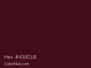 Hex #430d1b Color is a very dark rose color and the nearest color is Cab Sav #4d0a18. Hex code #430d1b and RGB value is rgb(67,13,27). In RGB color space, this color is composed of 26% red, 5% green, 11% blue, In CMYK color space, this color is composed of 0% cyan, 81% magenta, 60% yellow , 74% black , In HSL color space, this color has a hue angle of 344° , 68% saturation and 16% lightness.