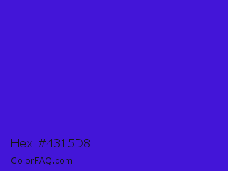 Hex #4315d8 Color is a normal indigo color and the nearest color is Interdimensional Blue #360ccc. Hex code #4315d8 and RGB value is rgb(67,21,216). In RGB color space, this color is composed of 26% red, 8% green, 85% blue, In CMYK color space, this color is composed of 69% cyan, 90% magenta, 0% yellow , 15% black , In HSL color space, this color has a hue angle of 254° , 82% saturation and 46% lightness.