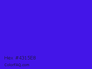 Hex #4315e8 Color is a normal indigo color and the nearest color is Han Purple #5218fa. Hex code #4315e8 and RGB value is rgb(67,21,232). In RGB color space, this color is composed of 26% red, 8% green, 91% blue, In CMYK color space, this color is composed of 71% cyan, 91% magenta, 0% yellow , 9% black , In HSL color space, this color has a hue angle of 253° , 83% saturation and 50% lightness.