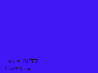 Hex #4317f5 Color is a normal indigo color and the nearest color is Han Purple #5218fa. Hex code #4317f5 and RGB value is rgb(67,23,245). In RGB color space, this color is composed of 26% red, 9% green, 96% blue, In CMYK color space, this color is composed of 73% cyan, 91% magenta, 0% yellow , 4% black , In HSL color space, this color has a hue angle of 252° , 92% saturation and 53% lightness.