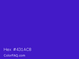 Hex #431ac8 Color is a normal indigo color and the nearest color is Interdimensional Blue #360ccc. Hex code #431ac8 and RGB value is rgb(67,26,200). In RGB color space, this color is composed of 26% red, 10% green, 78% blue, In CMYK color space, this color is composed of 67% cyan, 87% magenta, 0% yellow , 22% black , In HSL color space, this color has a hue angle of 254° , 77% saturation and 44% lightness.