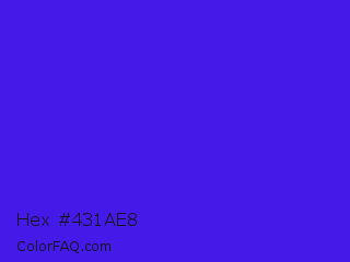 Hex #431ae8 Color is a normal indigo color and the nearest color is Han Purple #5218fa. Hex code #431ae8 and RGB value is rgb(67,26,232). In RGB color space, this color is composed of 26% red, 10% green, 91% blue, In CMYK color space, this color is composed of 71% cyan, 89% magenta, 0% yellow , 9% black , In HSL color space, this color has a hue angle of 252° , 82% saturation and 51% lightness.