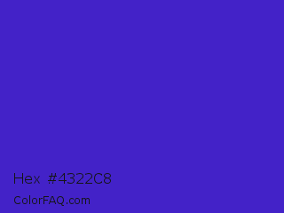 Hex #4322c8 Color is a normal indigo color and the nearest color is Interdimensional Blue #360ccc. Hex code #4322c8 and RGB value is rgb(67,34,200). In RGB color space, this color is composed of 26% red, 13% green, 78% blue, In CMYK color space, this color is composed of 67% cyan, 83% magenta, 0% yellow , 22% black , In HSL color space, this color has a hue angle of 252° , 71% saturation and 46% lightness.