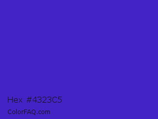 Hex #4323c5 Color is a normal indigo color and the nearest color is Interdimensional Blue #360ccc. Hex code #4323c5 and RGB value is rgb(67,35,197). In RGB color space, this color is composed of 26% red, 14% green, 77% blue, In CMYK color space, this color is composed of 66% cyan, 82% magenta, 0% yellow , 23% black , In HSL color space, this color has a hue angle of 252° , 70% saturation and 45% lightness.