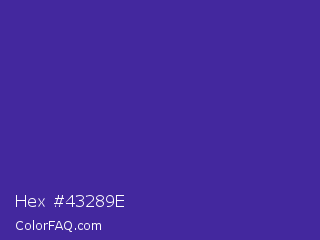 Hex #43289e Color is a normal indigo color and the nearest color is Daisy Bush #4f2398. Hex code #43289e and RGB value is rgb(67,40,158). In RGB color space, this color is composed of 26% red, 16% green, 62% blue, In CMYK color space, this color is composed of 58% cyan, 75% magenta, 0% yellow , 38% black , In HSL color space, this color has a hue angle of 254° , 60% saturation and 39% lightness.
