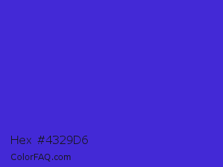 Hex #4329d6 Color is a normal indigo color and the nearest color is Interdimensional Blue #360ccc. Hex code #4329d6 and RGB value is rgb(67,41,214). In RGB color space, this color is composed of 26% red, 16% green, 84% blue, In CMYK color space, this color is composed of 69% cyan, 81% magenta, 0% yellow , 16% black , In HSL color space, this color has a hue angle of 249° , 68% saturation and 50% lightness.