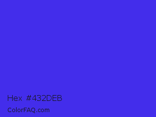 Hex #432deb Color is a normal indigo color and the nearest color is Han Purple #5218fa. Hex code #432deb and RGB value is rgb(67,45,235). In RGB color space, this color is composed of 26% red, 18% green, 92% blue, In CMYK color space, this color is composed of 71% cyan, 81% magenta, 0% yellow , 8% black , In HSL color space, this color has a hue angle of 247° , 83% saturation and 55% lightness.