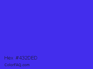 Hex #432ded Color is a normal indigo color and the nearest color is Han Purple #5218fa. Hex code #432ded and RGB value is rgb(67,45,237). In RGB color space, this color is composed of 26% red, 18% green, 93% blue, In CMYK color space, this color is composed of 72% cyan, 81% magenta, 0% yellow , 7% black , In HSL color space, this color has a hue angle of 247° , 84% saturation and 55% lightness.